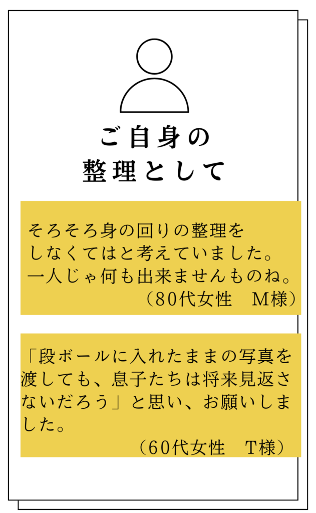 亡くなった両親の写真をスキャンするまでは自分でやっていたが、1冊に整理しようとして頓挫していた。一人では時間が取れず、やり方も分からなかったが、西村さんが上手くサポートしてくれて自分の想像よりもずっと立派な写真集を作成できた。ずっと気になっていた写真の遺品整理を終えられて、心が軽くなった。