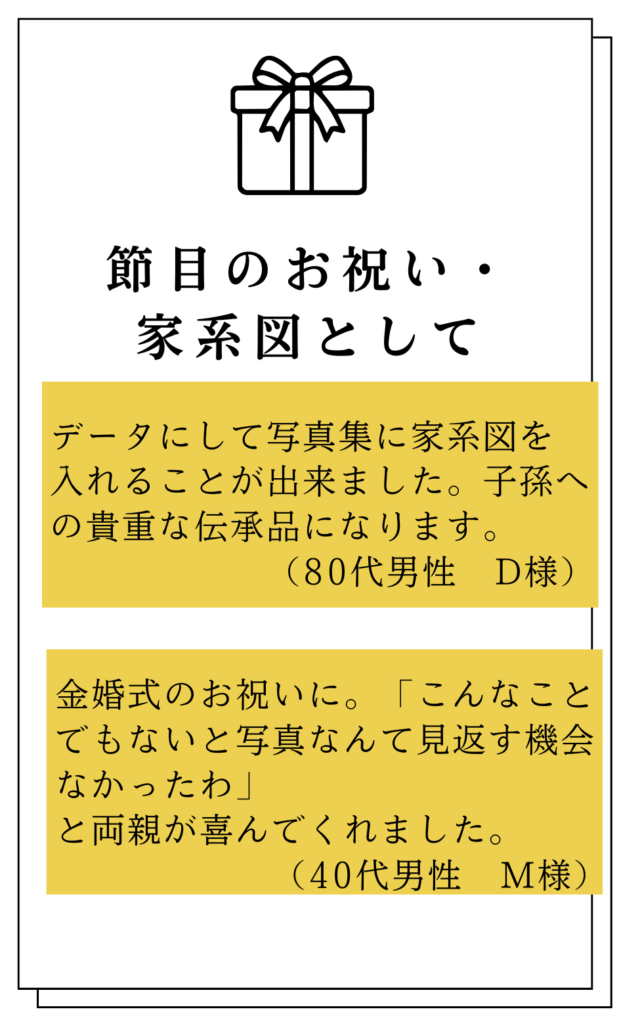 自分の身辺整理をしていましたが、段ボールに入れたままの写真を渡したところで、息子たちは将来見返すことなんてしないだろうと思い、電話をしました。月末には手にしたいと急がせてしまい申し訳ありませんでした。貴女に出会えて良かった。素敵な出来栄えです。有難う御座いました。